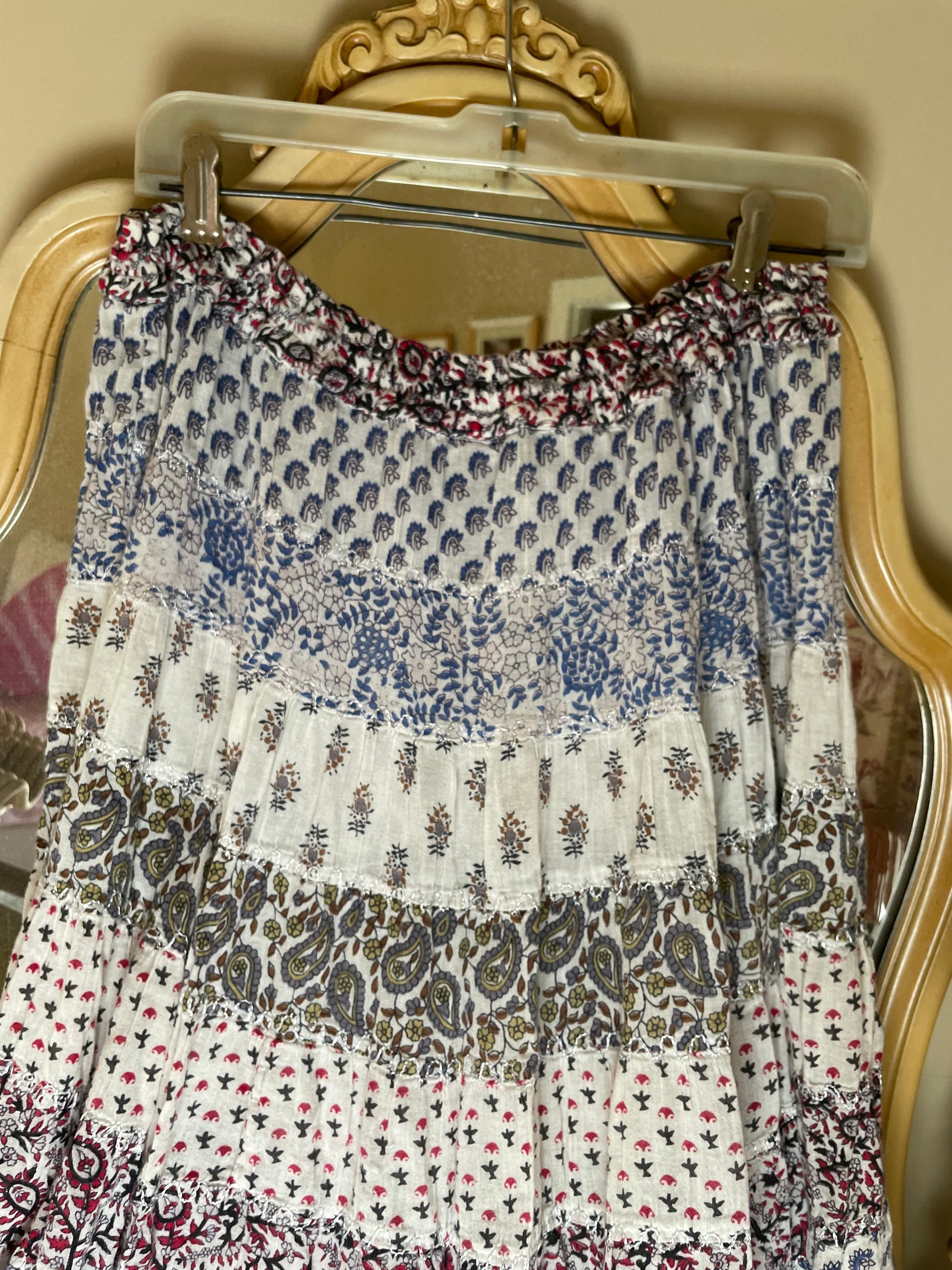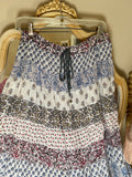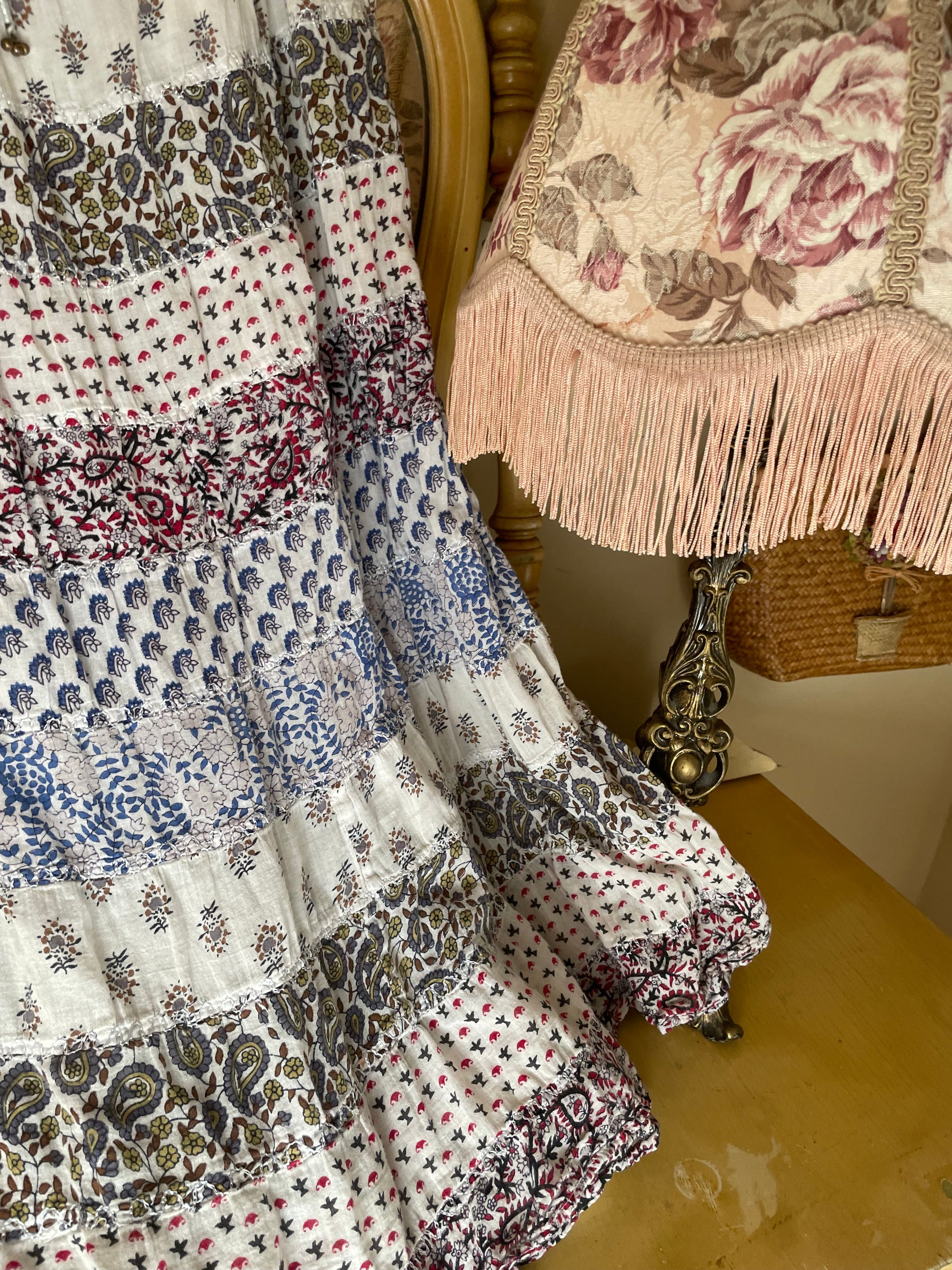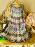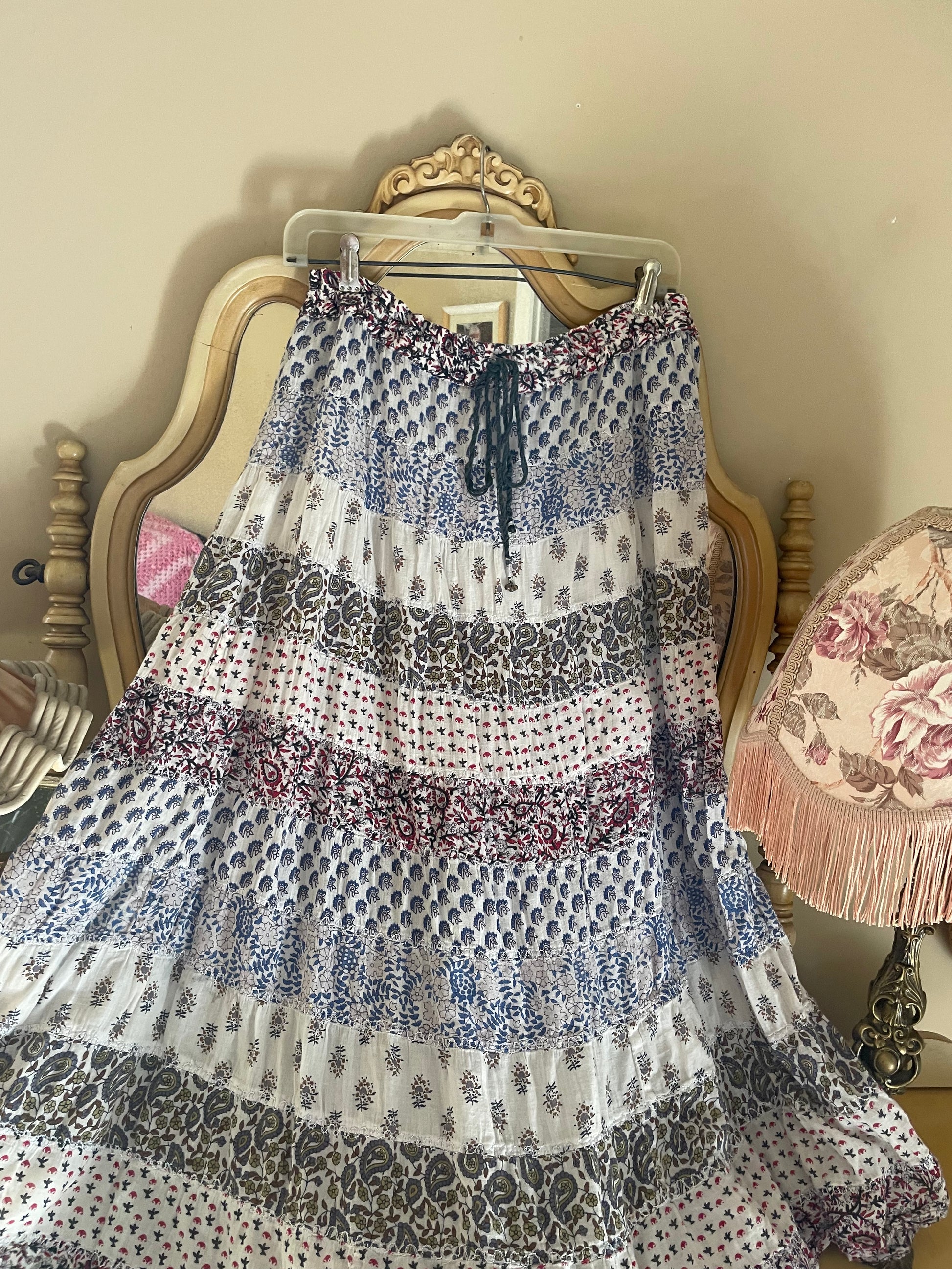 This vintage India cotton skirt captures the free-spirited ease of the 70s—lightweight, tiered, and made to move with you. Its adjustable drawstring waist adds effortless comfort, while the airy cotton brings that sun-kissed, wanderer charm.