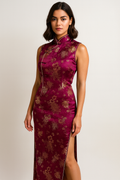 This 70s silky chemise dress captures the refined beauty of traditional design—its smooth floral poly-rayon fabric, mandarin collar, and side button-loop closures creating a look that feels both classic and quietly glamorous. The long side slits add fluid movement, making it a timeless piece meant to be treasured.
