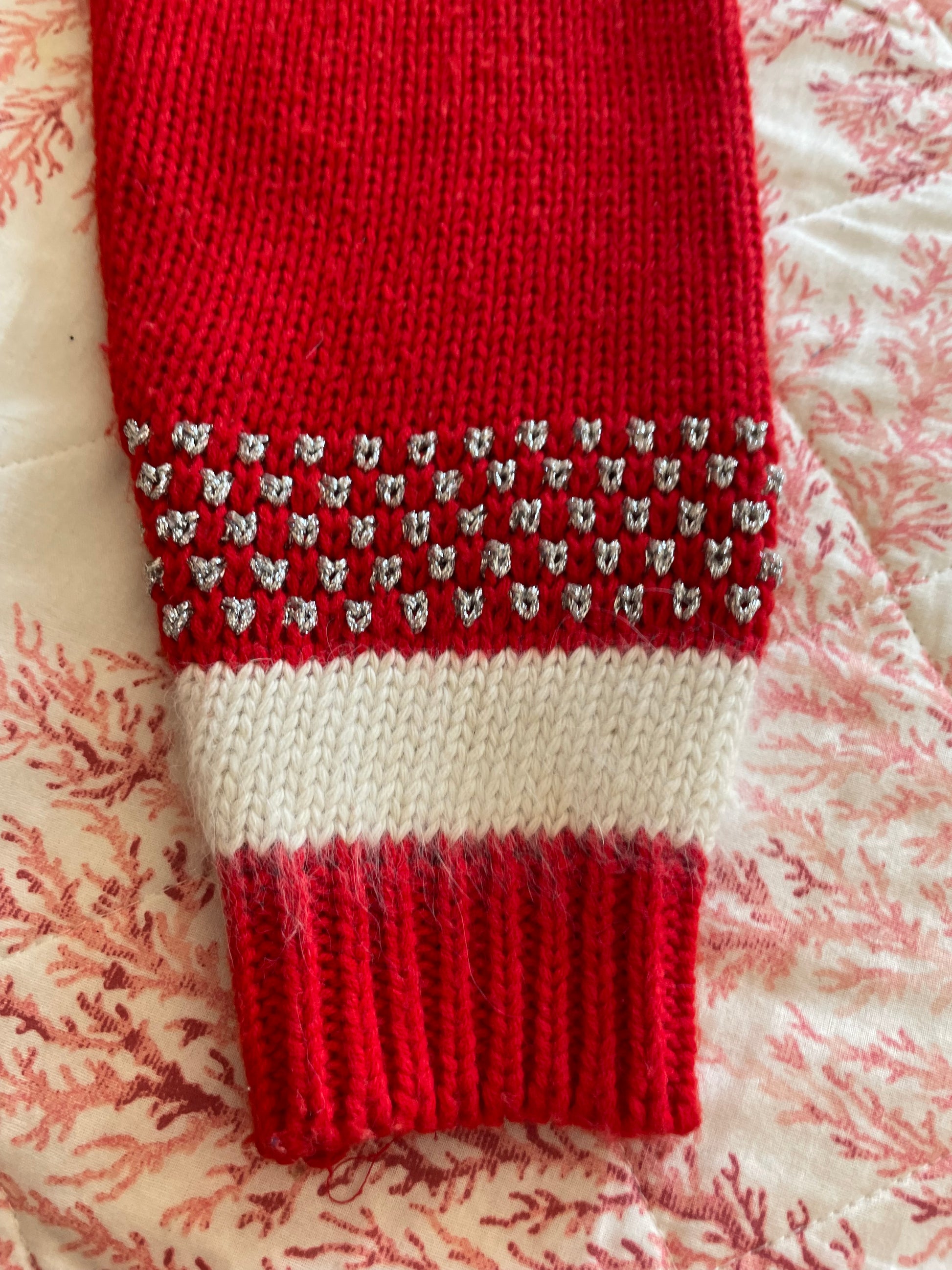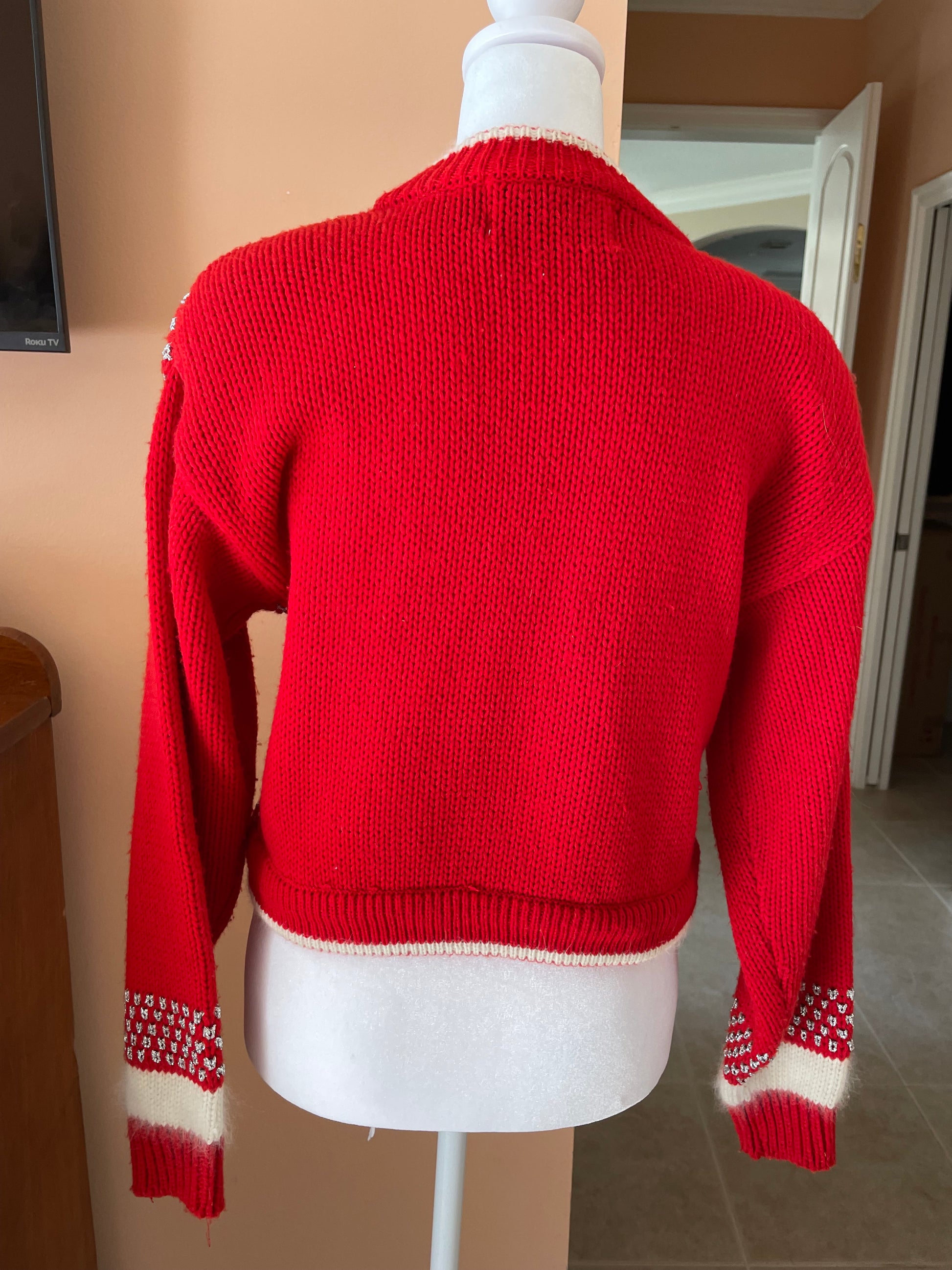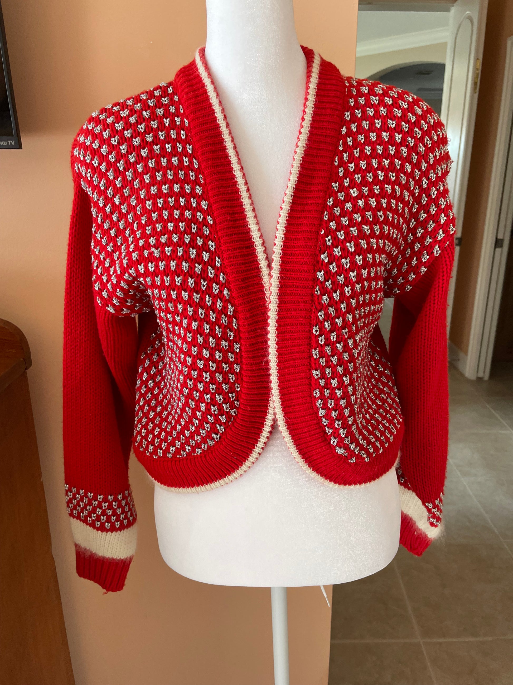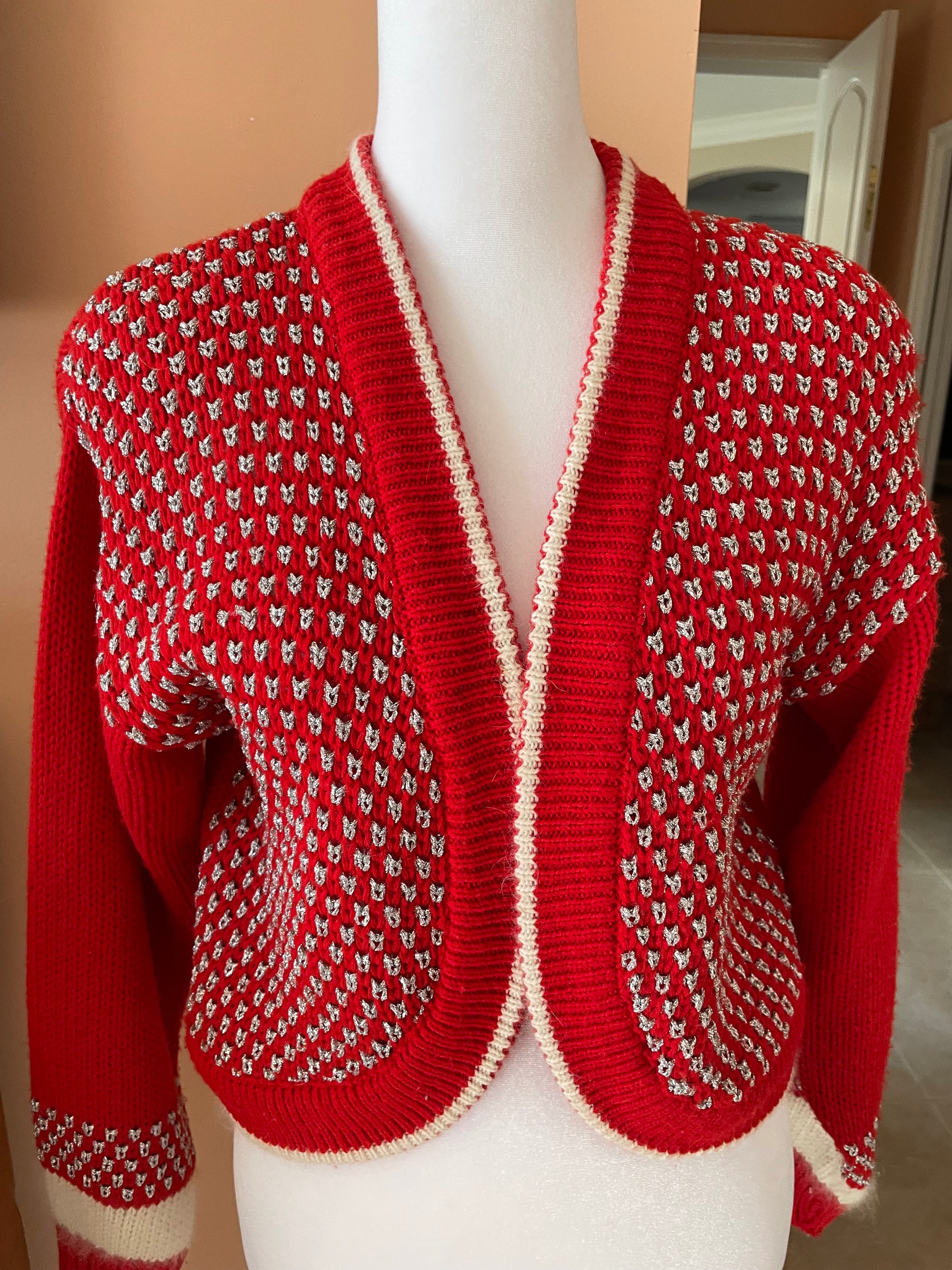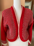 Vintage 80s Angora Blend Red Shimmery Silver Details Cardigan Knit Sweater Sm