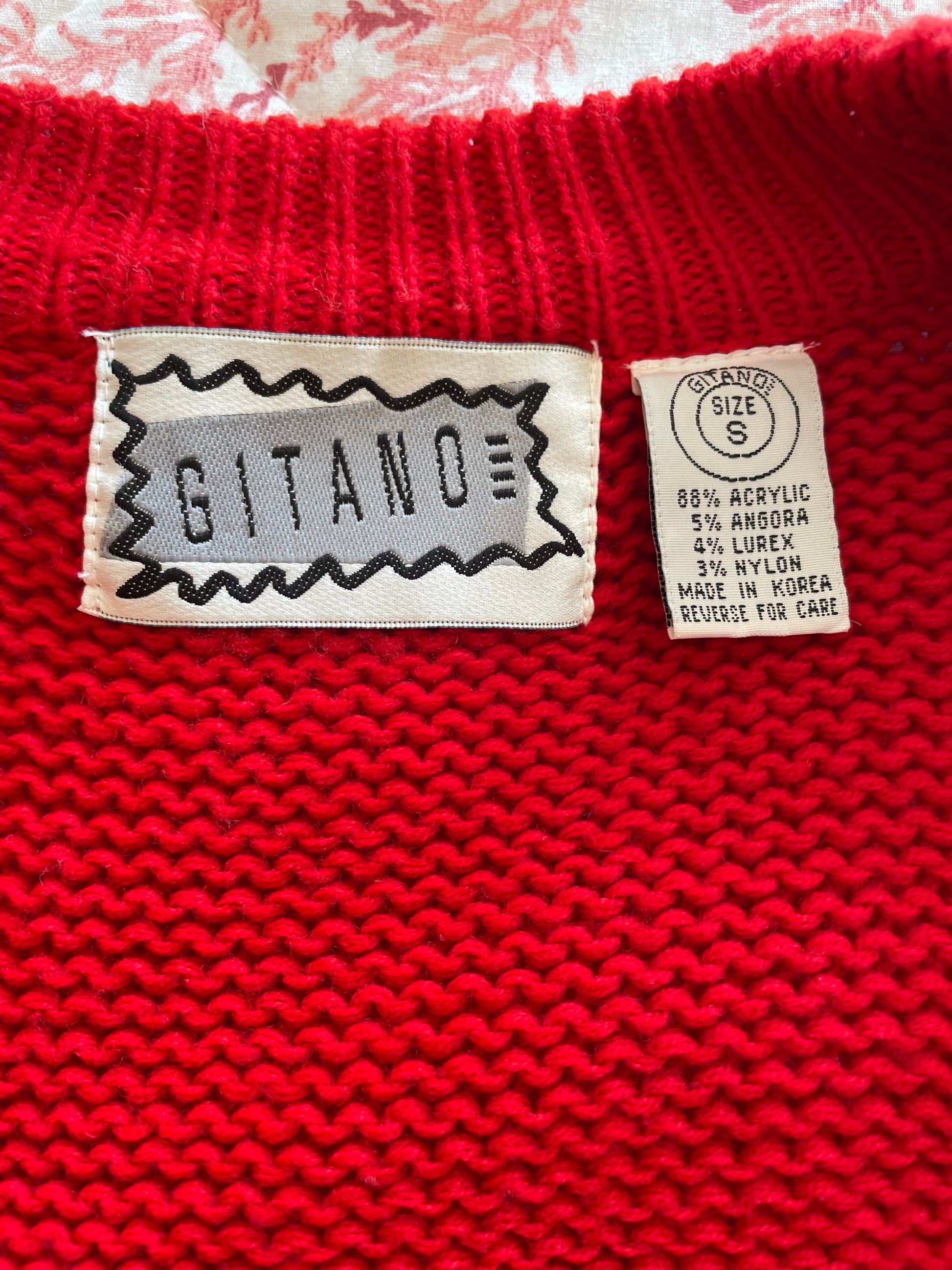 Rare Gitano Brand holiday sweater. Open in front. Removable shoulder pads. Acrylic angora lurex blend. Cropped length. Vintage 80s sweaters.Β