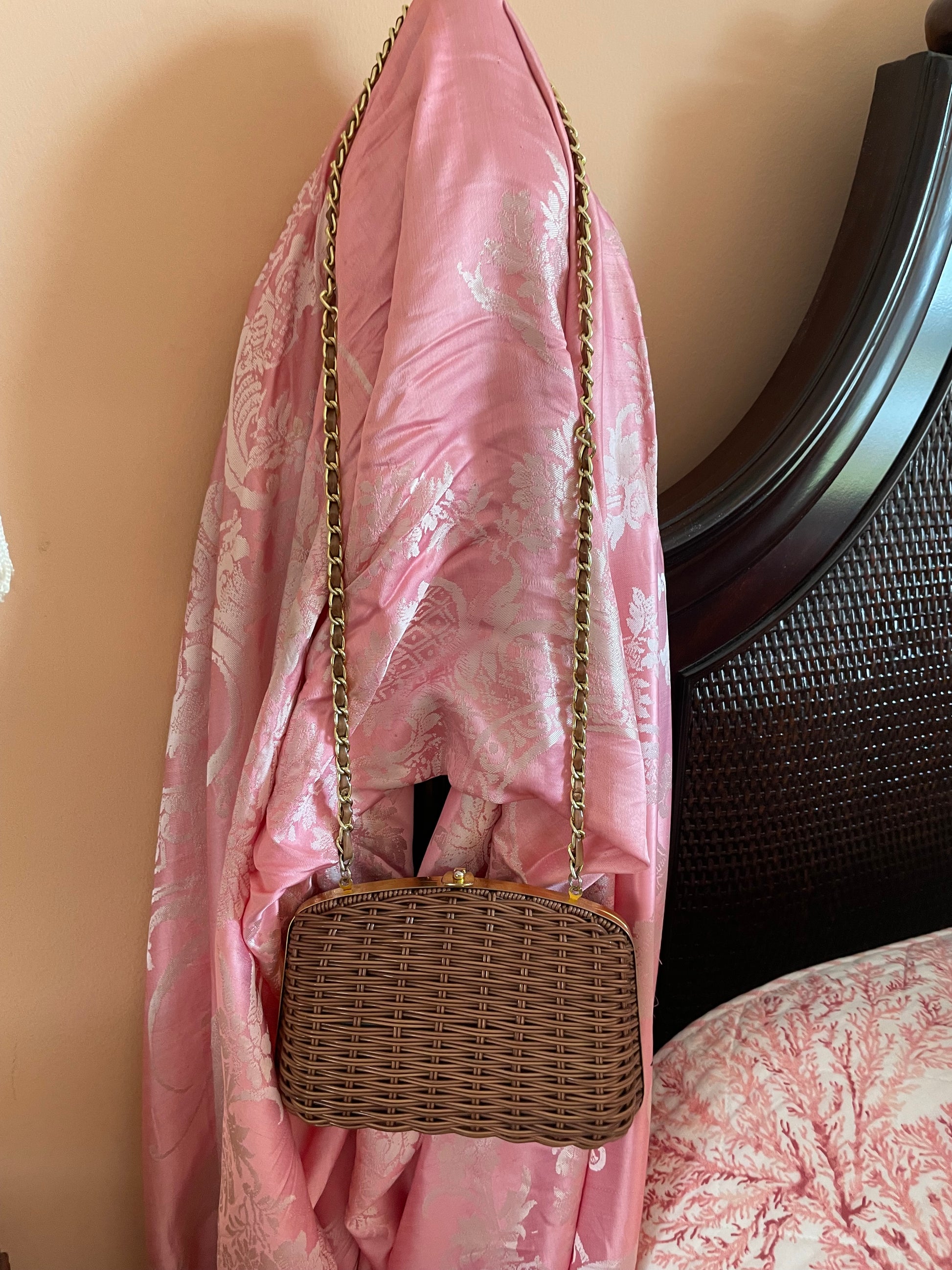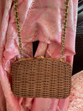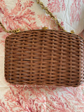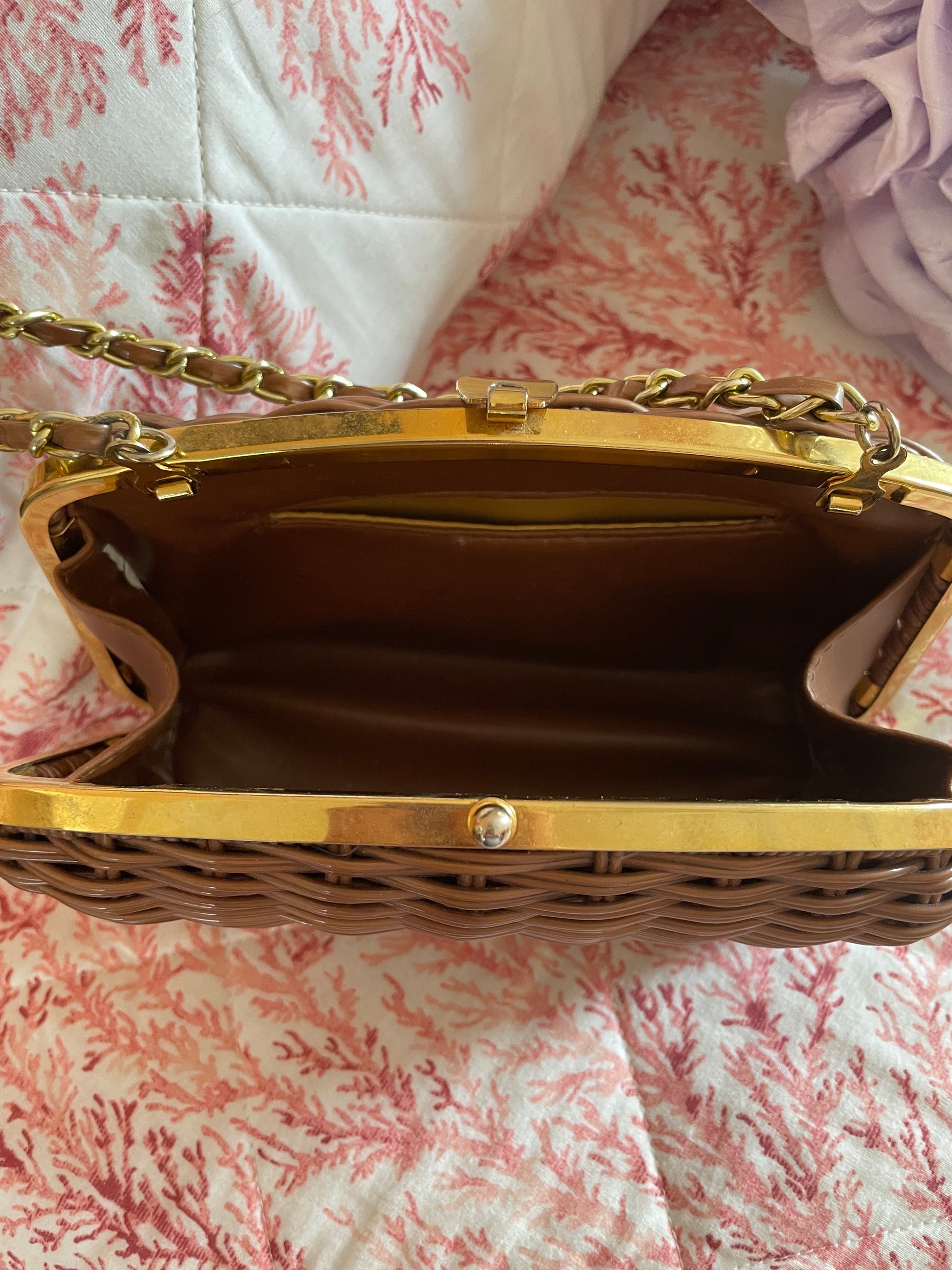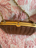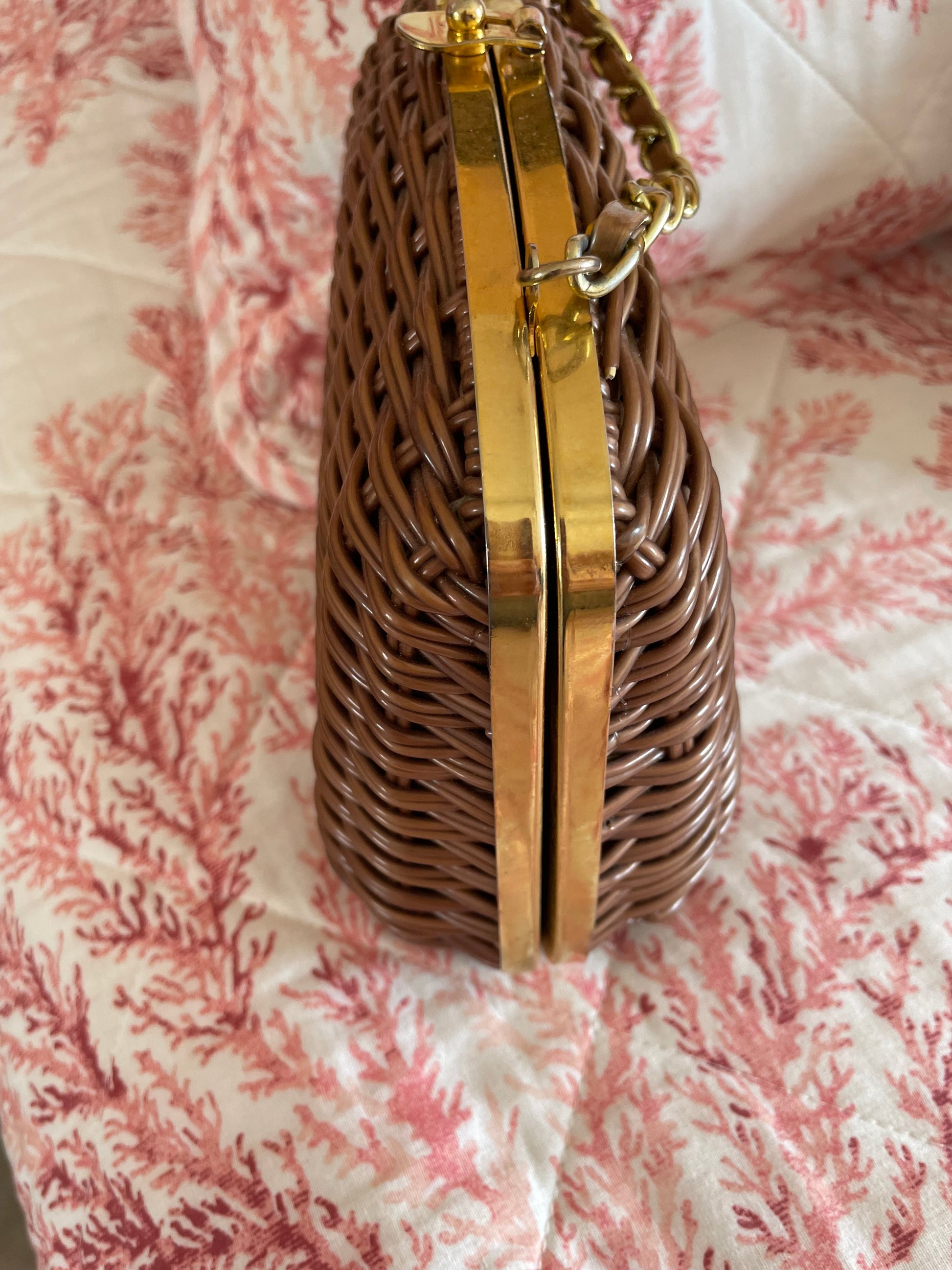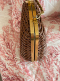Vintage 80s Brown Woven Wicker Structured Gold Frame Purse
