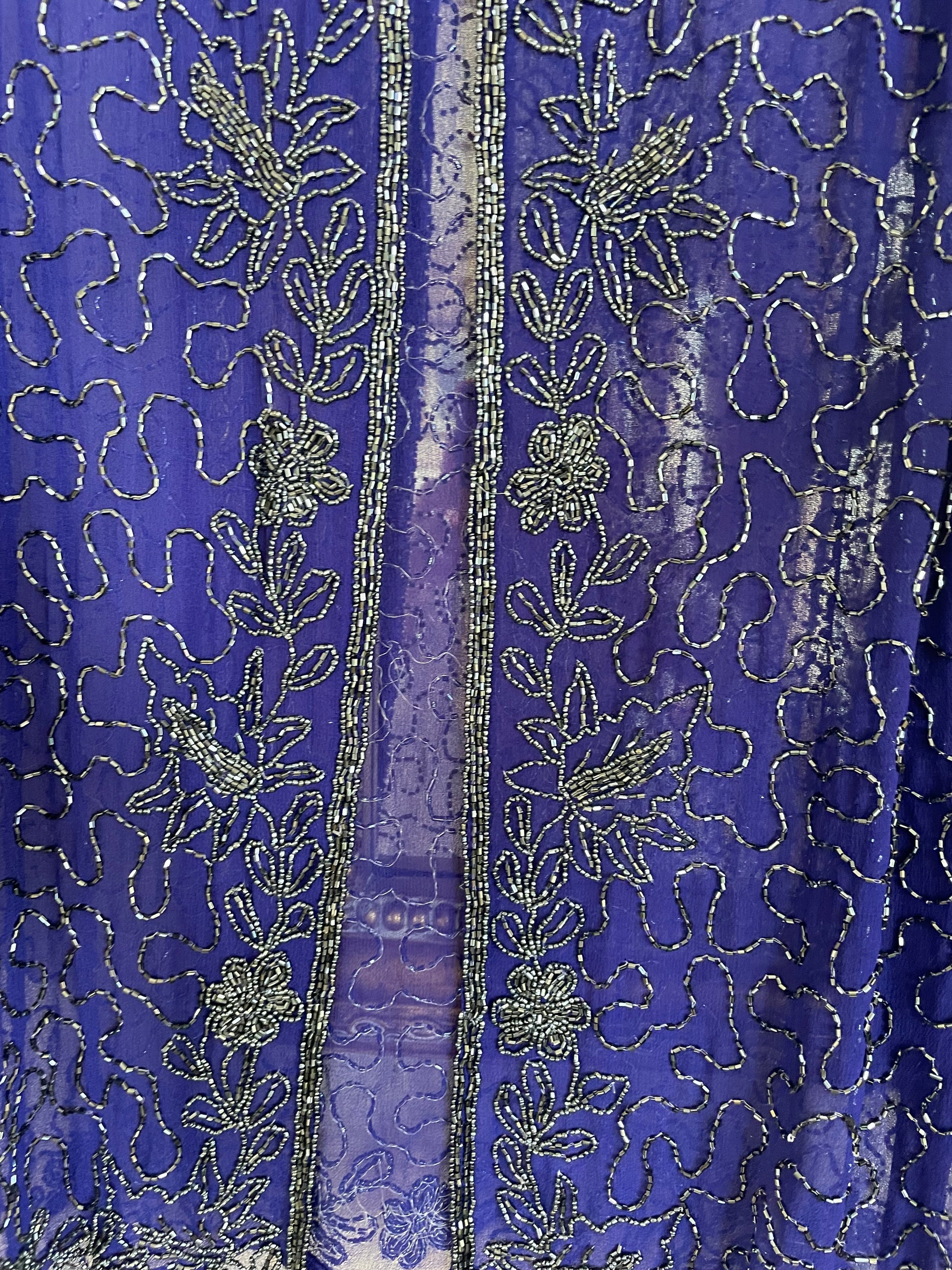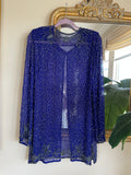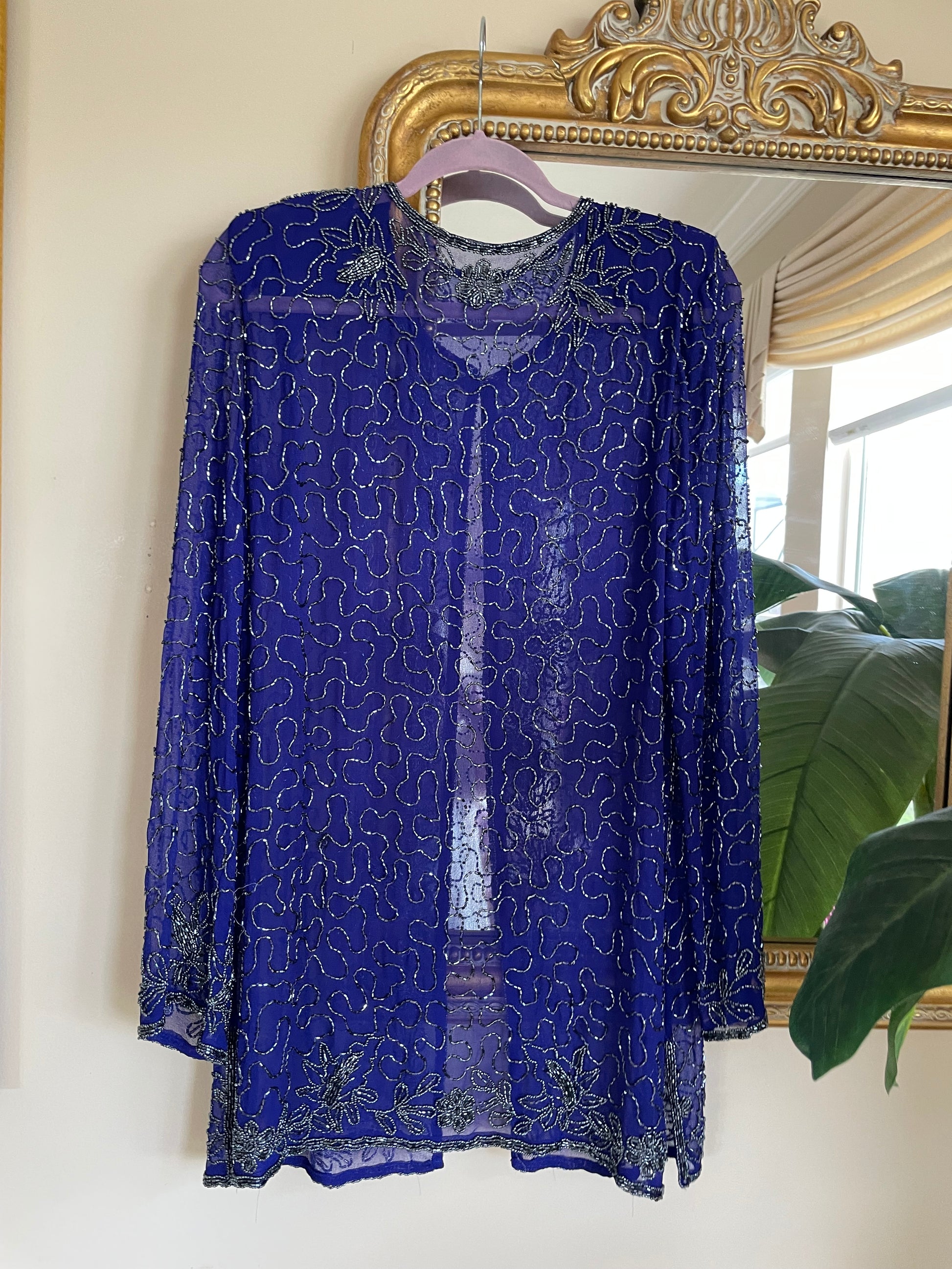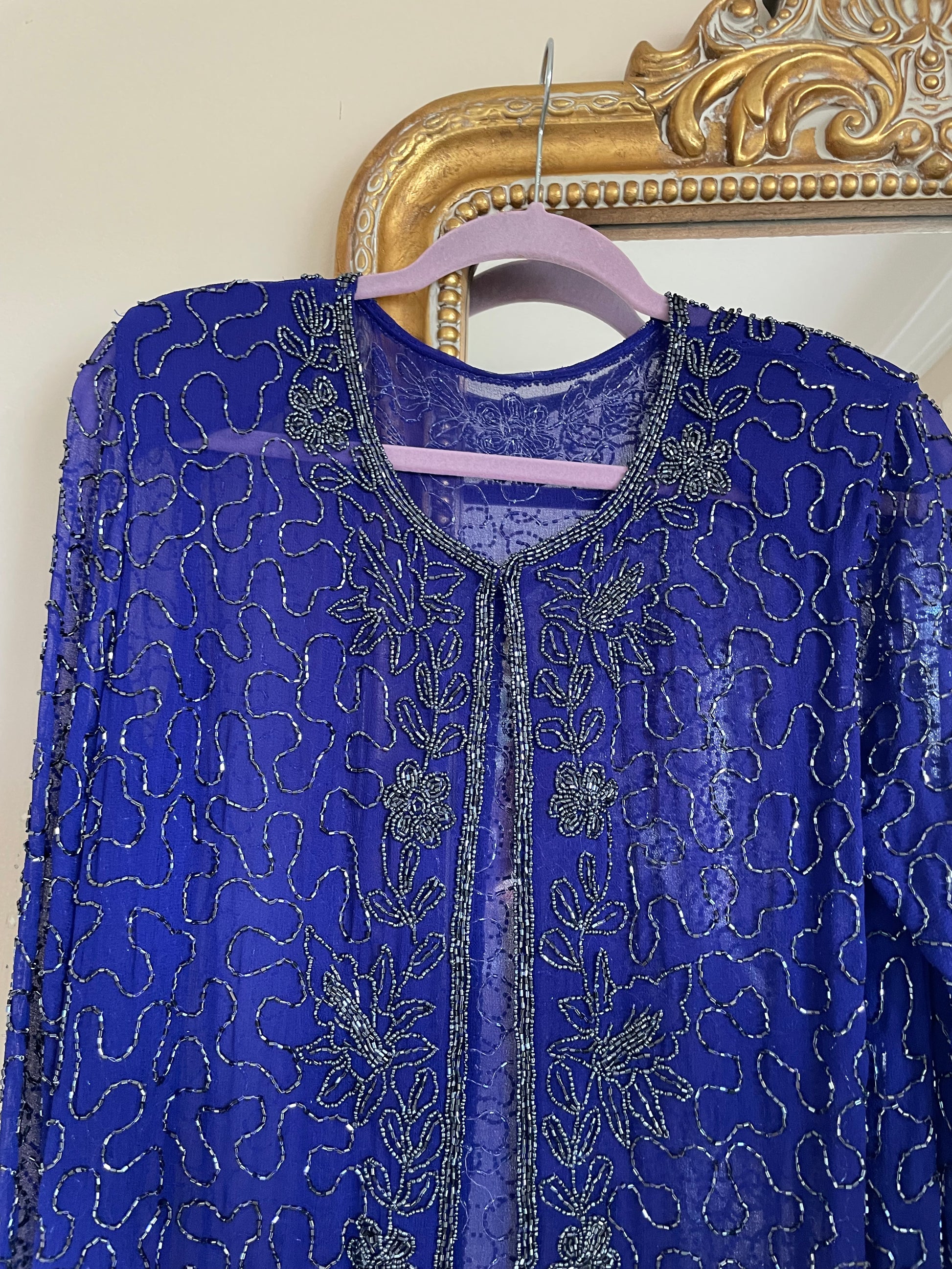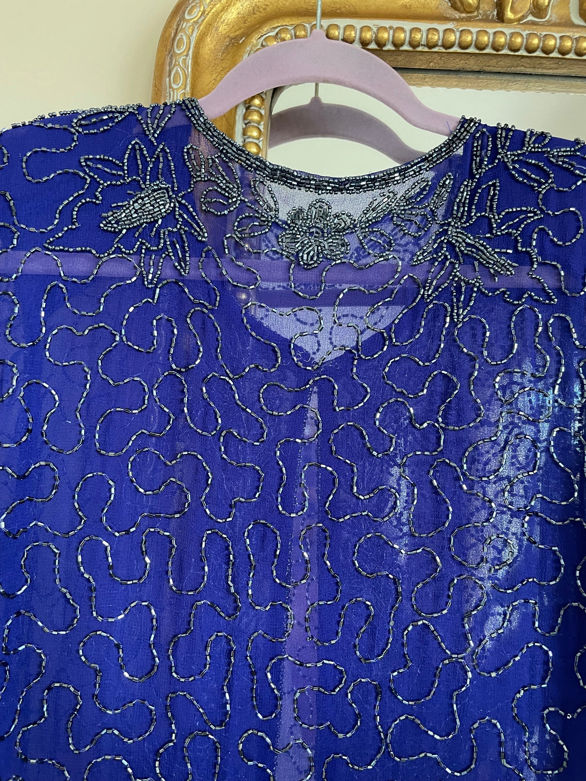 Sheer Dark blue fabric. Amazing floral scroll silver bead design. Glittering evening wear. Glam style Open in front with one tiny snap closure at neckline One of a kind Handmade Excellent condition Med size