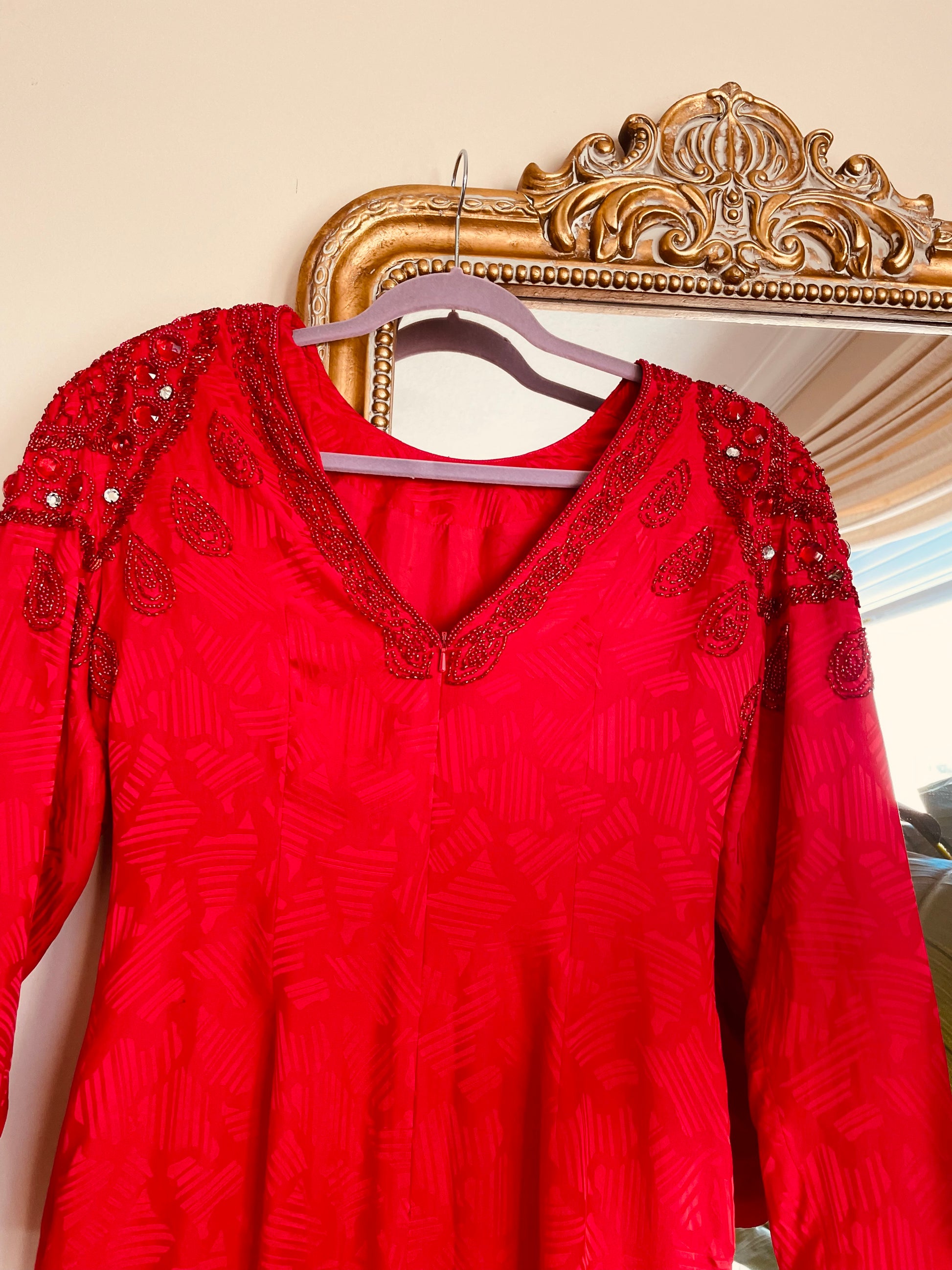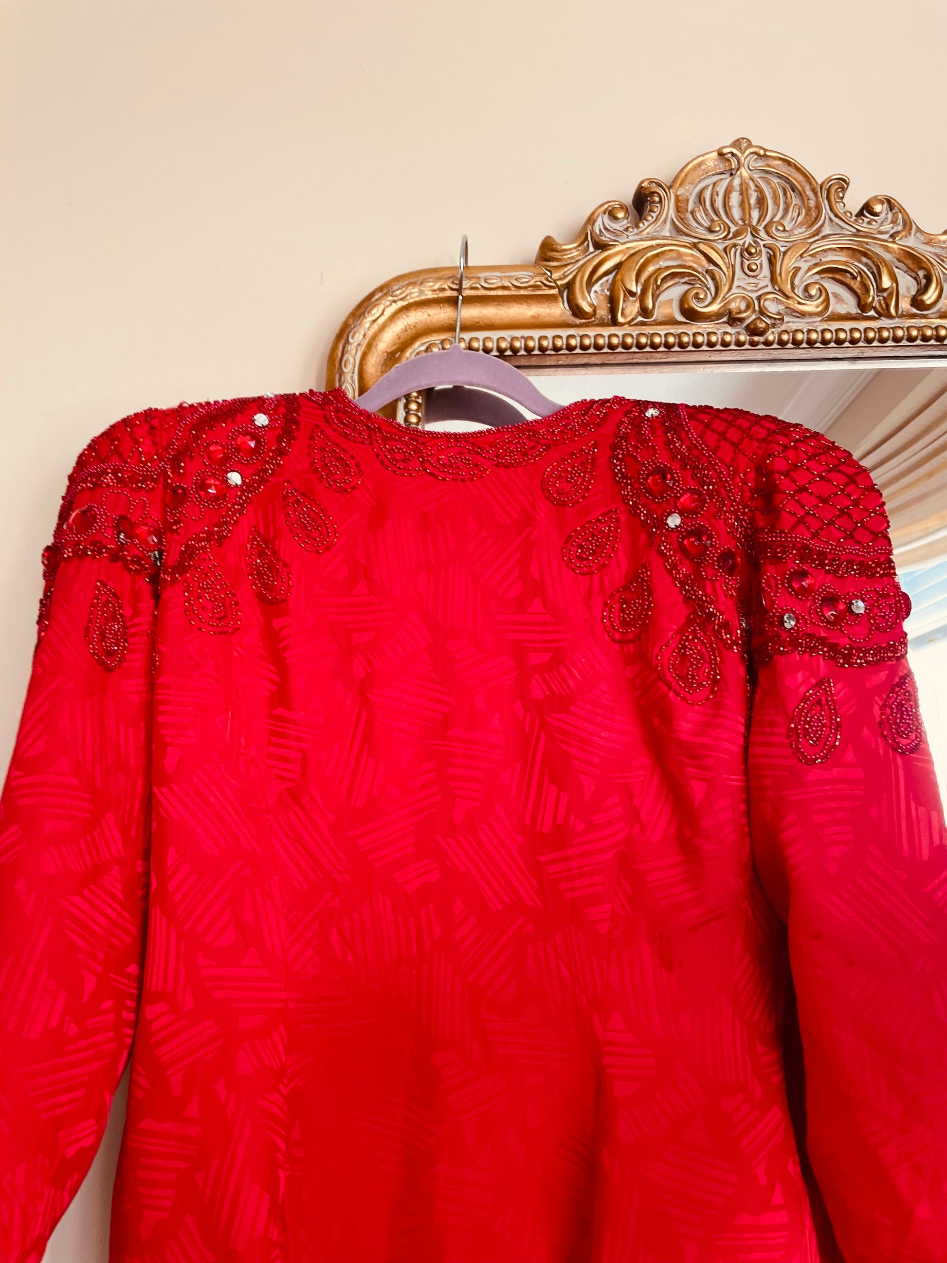 This dazzling 80s dress captures pure vintage glamour. Hand-beaded in radiant red, it glimmers under light and embodies the bold spirit of the decade—elegant, confident, unforgettable.