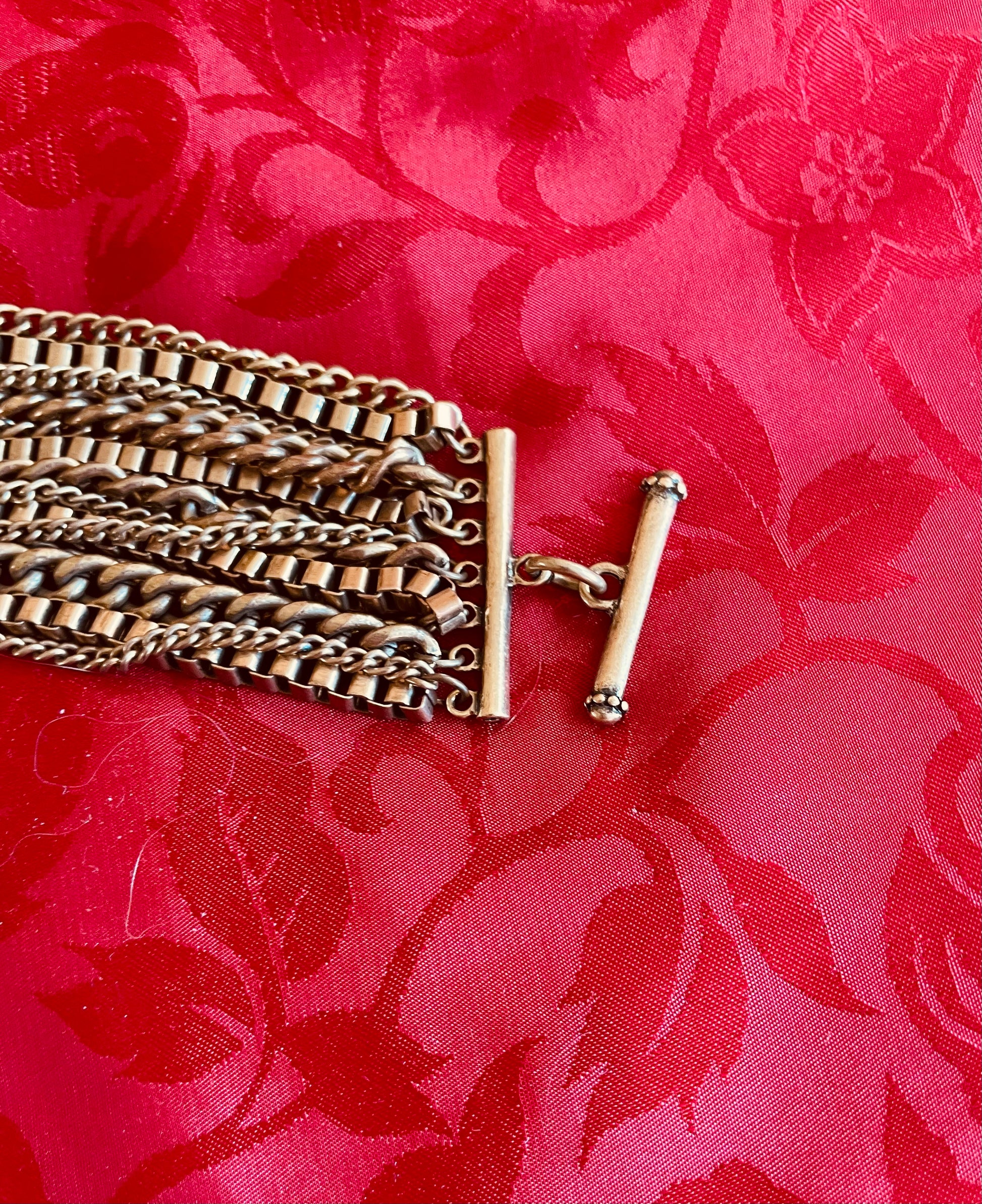 Toggle closure. Quality chunky statement bracelet. Vintage jewelry. Draped bronze tone chain bracelets. Day to evening bracelets.