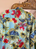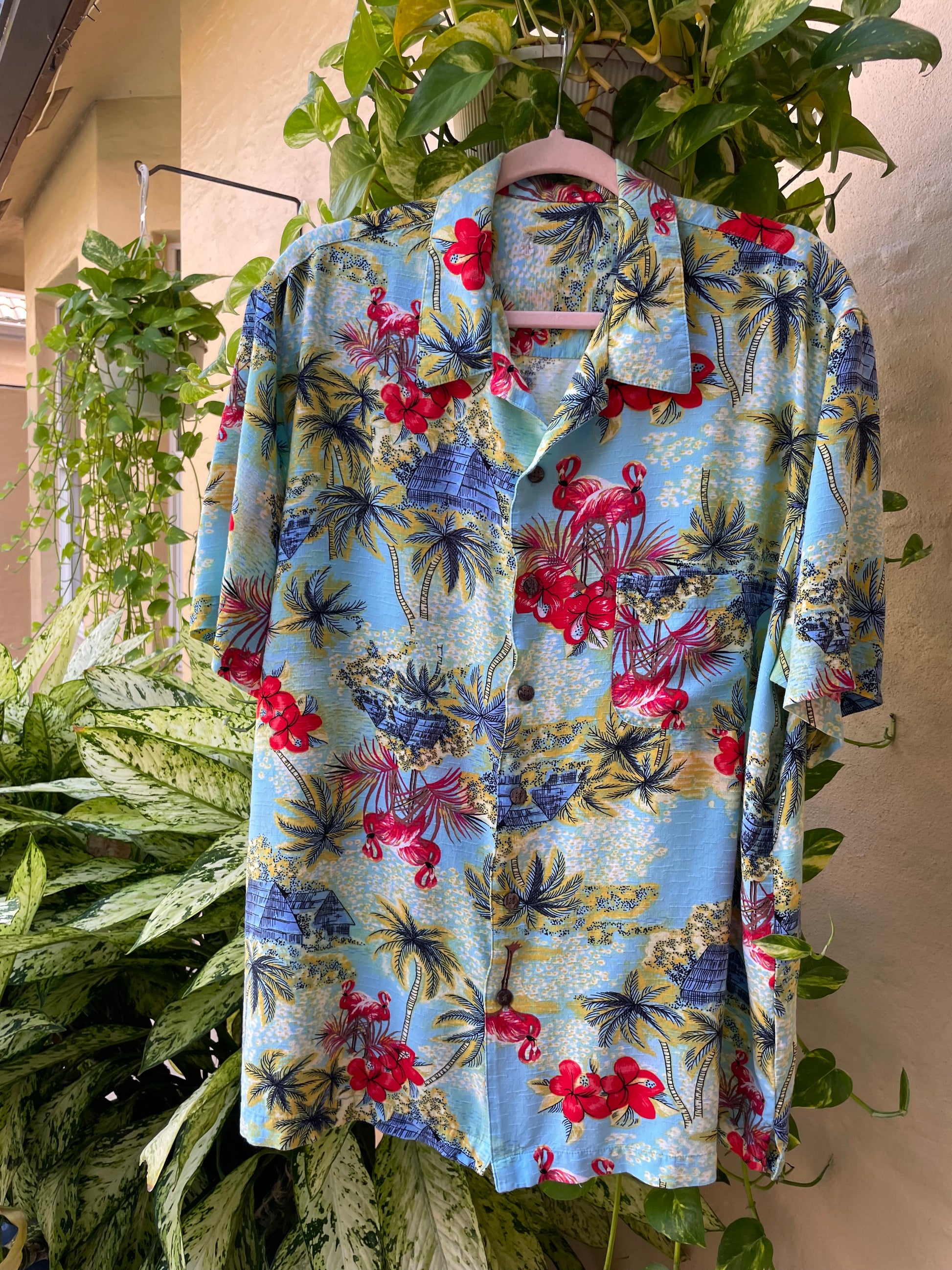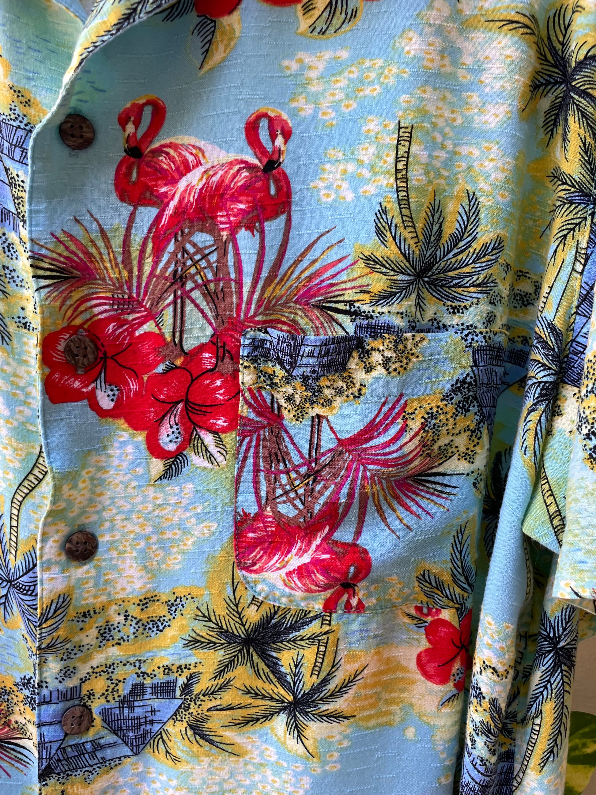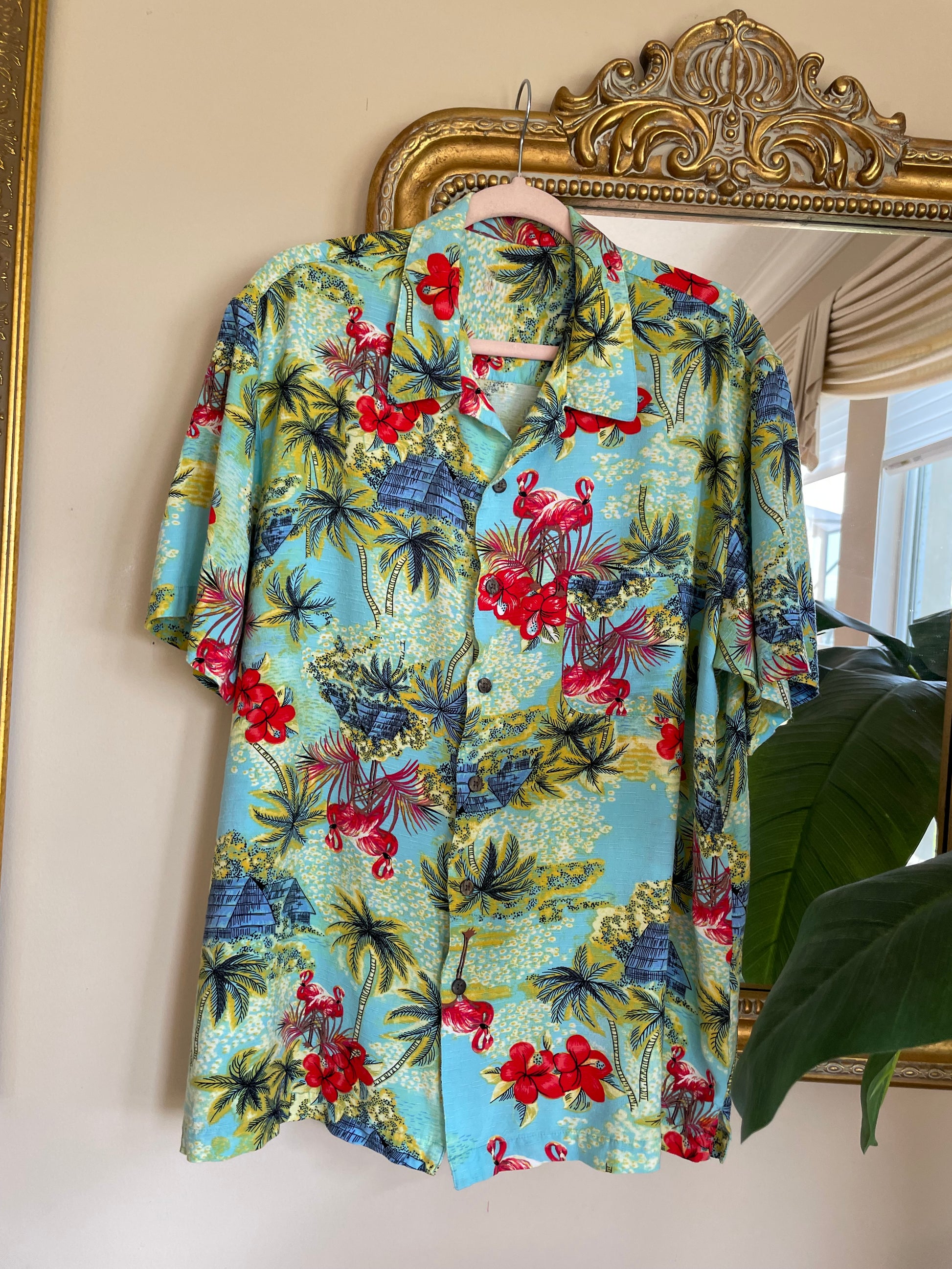 This vintage men’s flamingo print shirt channels laid-back Florida energy with a colorful beachy pattern and timeless resort feel. The breezy fit, lightweight fabric, and wood button details make it the perfect piece for sunny getaways or casual weekends under palm trees.