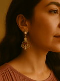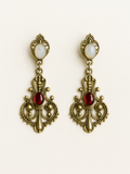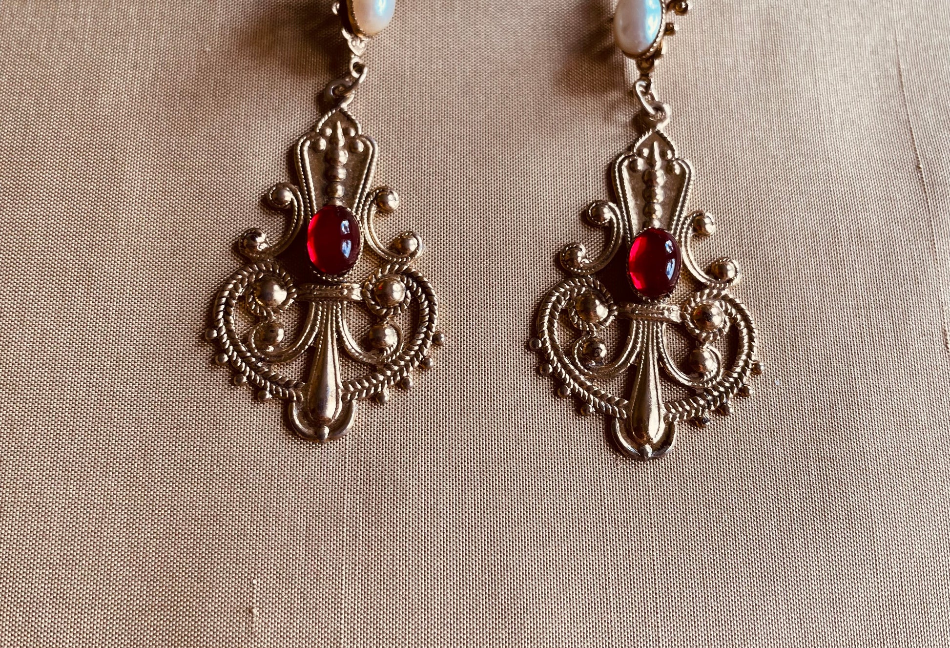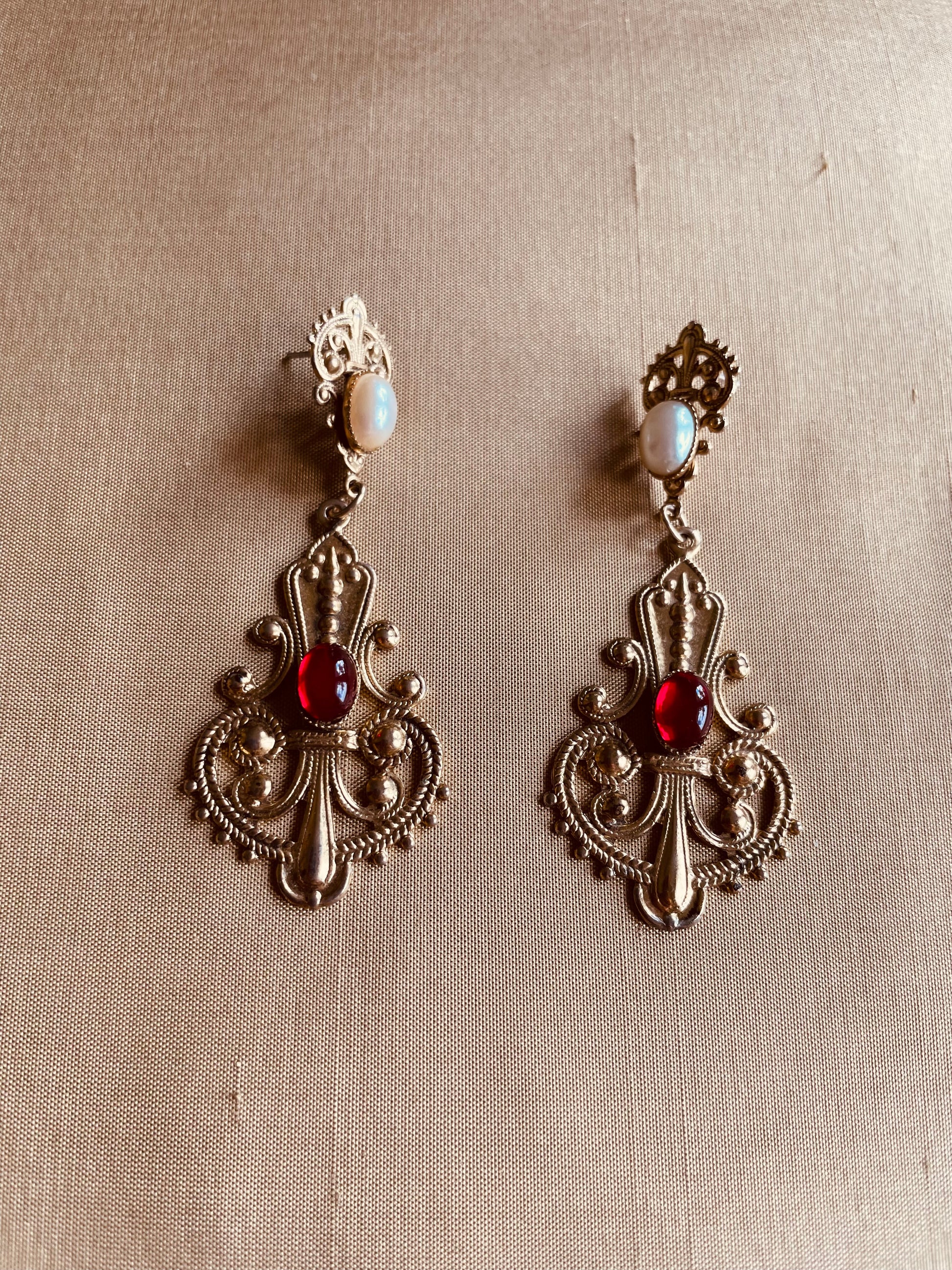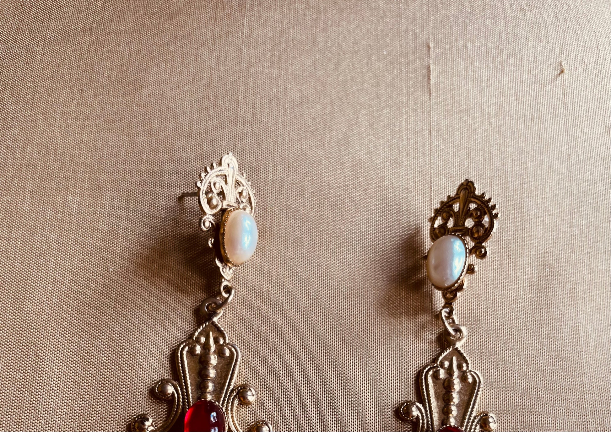 These earrings balance delicate faux pearls with vivid red glass, creating a piece that evokes old Hollywood charm with a contemporary spark.