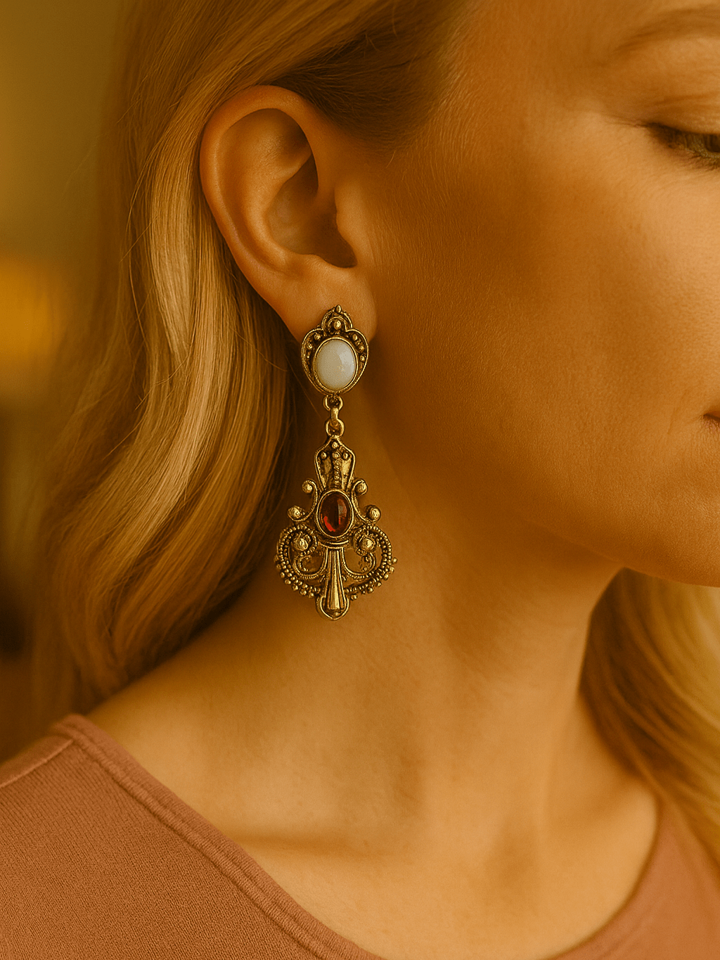 ✓ Faux pearls with red glass stones – A captivating contrast of softness and fire.