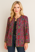 This Maggie London 100% silk jacket top brings bold 80s artistry to modern dressing. Its colorful paisley print, finished with elegant gold trim, creates a striking statement piece that transitions effortlessly from daytime polish to evening allure. Soft, fluid silk gives it a luxurious drape, while looped black button closures add a refined vintage touch.