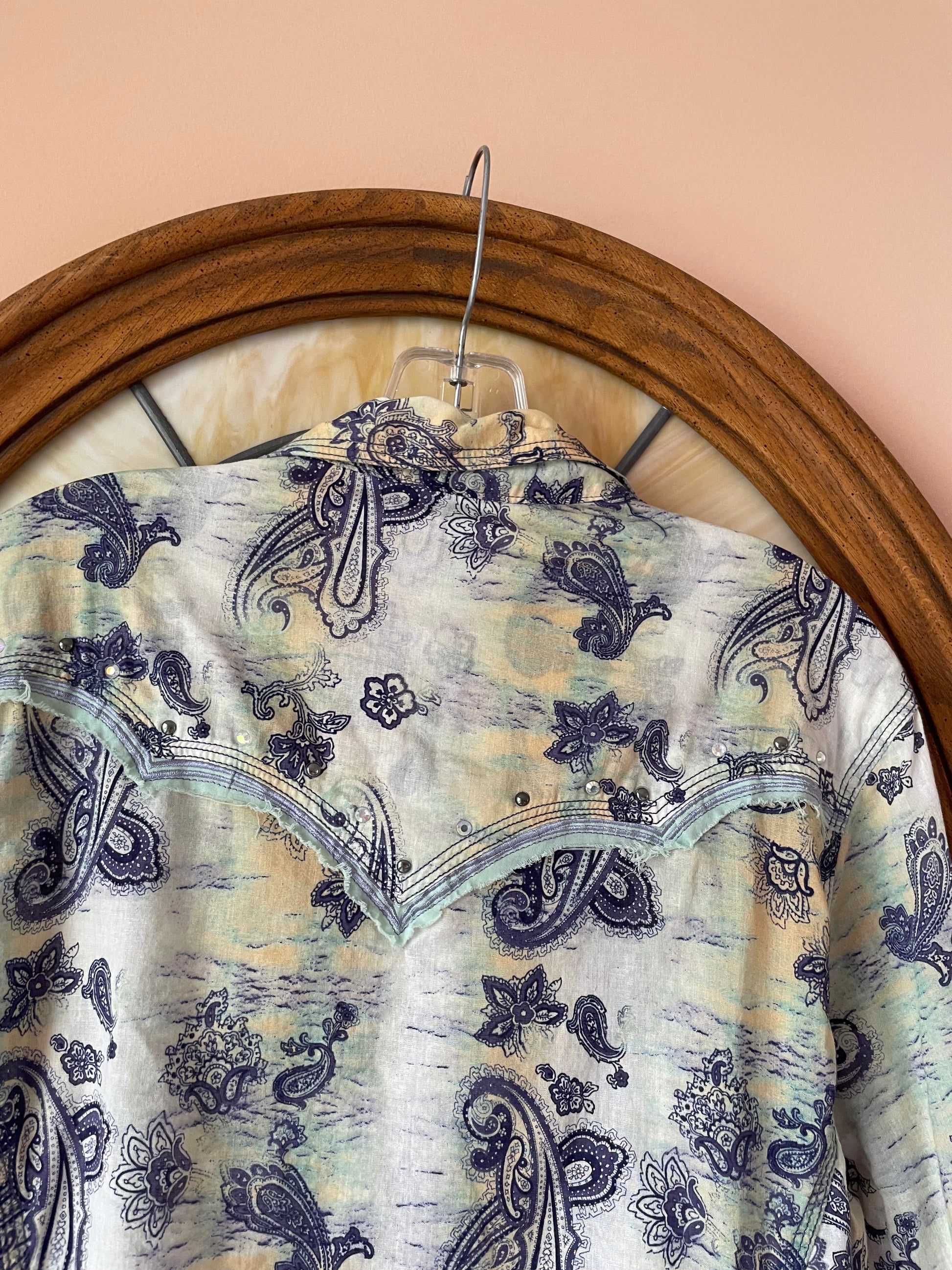 Features. Long Sleeve. Snap closures. 100% cotton. Paisley Floral Tie Dye print. Glittering beads on top. Lightweight breathable fabric. Washable.